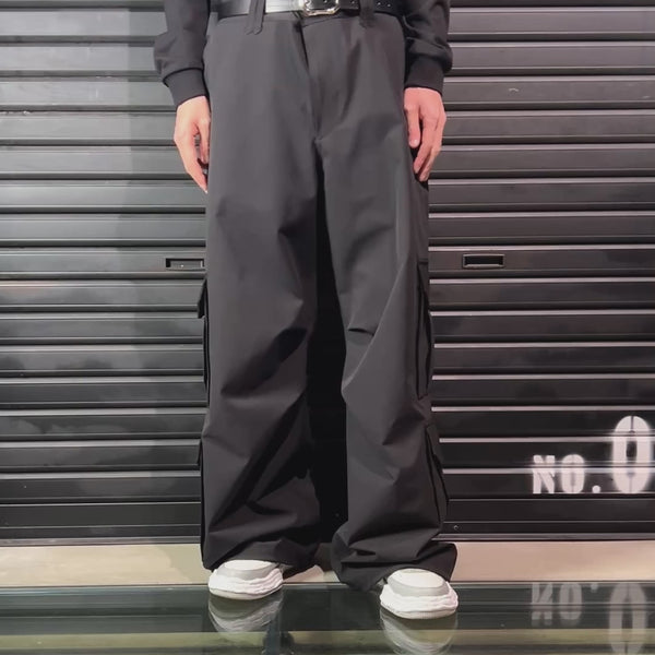 ストレッチ性、耐久性に優れたハイスペックな撥水ポリエステルを使用したワイドカーゴパンツ。裾幅はドローコードで調節可能。