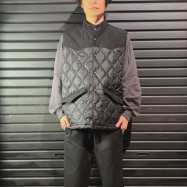 チェーン柄の刺繍でナイロンタフタと中綿をキルティングしたミリタリーキルト素材を使用したウエスタンベスト。バックヨークにクロスガンコード刺繍。